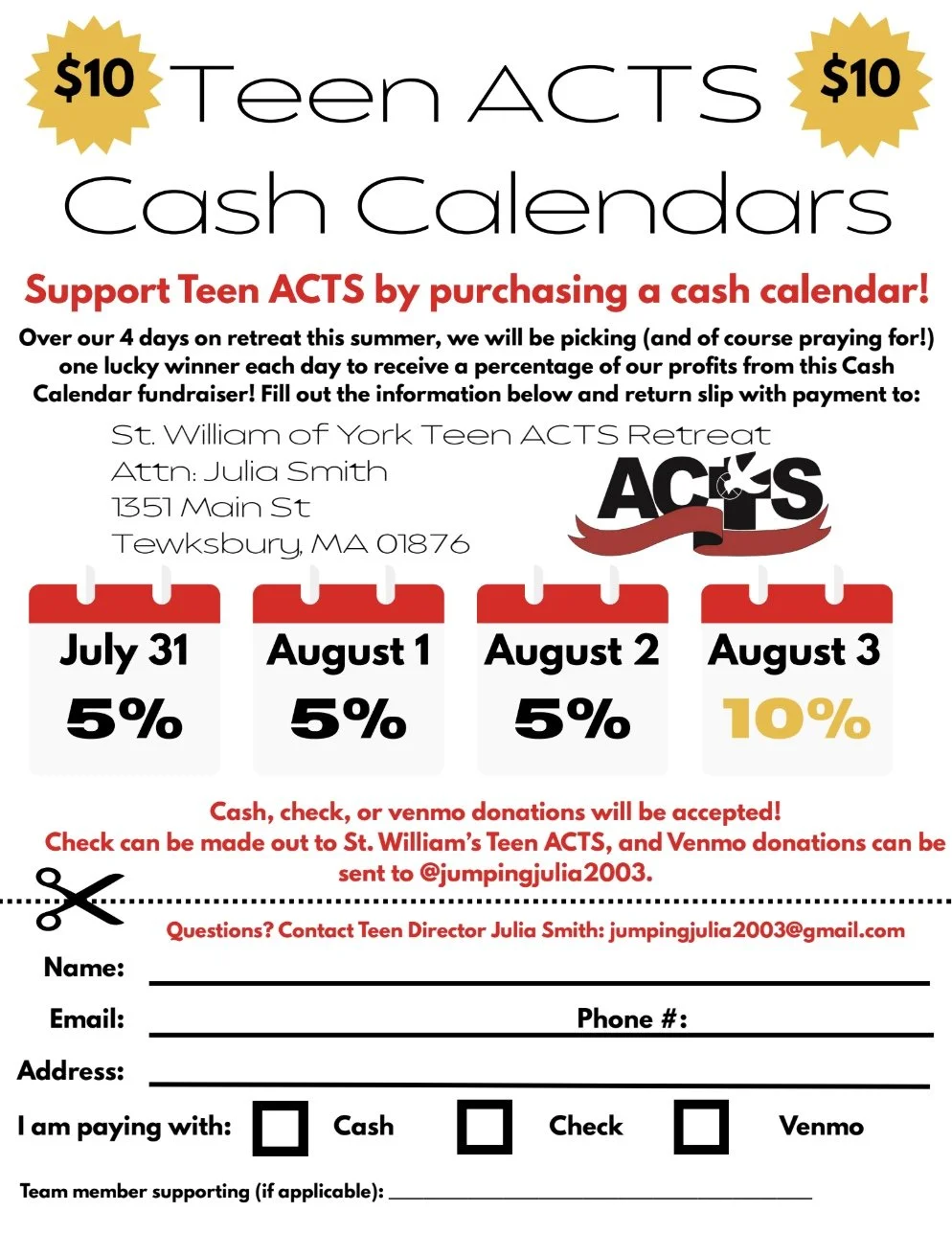 Thank you for choosing to sponsor a teen, the weekend would not be possible without your support. Please mail a check to the address below. You can also purchase as many cash calendars as you would like! Top winner last year won $116!